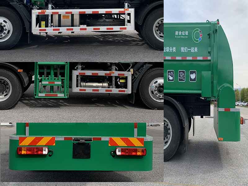 仅用3800mm轴距;侧防护装置材质为铝合金,连接方式:螺栓连接;后防护装置由专用作业装置代替,离地高度为410mm;ABS系统型号/生产企业:ABS-E/威伯科汽车控制系统(中国)有限公司,ABS/ASR-24V-4S/4M/东科克诺尔商用车制动系统(十堰)有限公司;车辆装有侧装垃圾桶升降装置、封闭式垃圾箱、推卸机构等装置,用于餐厨垃圾收集,转运及卸料作业;安装具有卫星定位功能的行驶记录仪;随底盘选装驾驶室外观;选装清洗装置;该车型可选装ETC车载装置. |