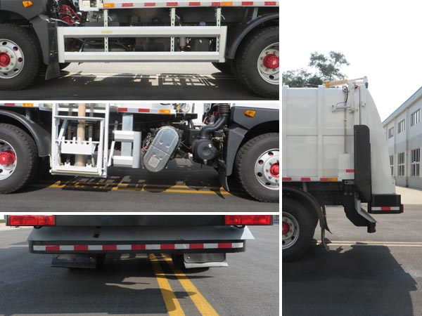 车辆装有侧装垃圾桶升降装载装置、密封式垃圾箱体、推卸机构、后卸料门等专用装置,主要用来收集和转运餐厨垃圾.仅选用3950mm轴距.随底盘选装限速装置,限速89km/h.随底盘选装驾驶室.选装带卸料装置后门,对应整备质量8400kg,额定载质量7605kg(驾驶室准乘人数3人);7670kg(驾驶室准乘人数2人).选装箭头式作业指示灯.选装新式车辆外部标识牌.随底盘选装踏板反射器.随底盘选装铝合金油箱.选装加热装置.选装称重系统.选装单开启式入料口.选装导流挡板.ABS系统生产厂家,型号:焦作博瑞克控制技术有限公司,J ABS;襄阳东风隆诚机械有限责任公司,ABS/ASR-24V-4S/4M.车辆侧面防护装置的材料材质为铝合金,连接方式为螺栓连接.后下部防护装置的材料材质为Q235钢,连接方式为焊接,断面尺寸(mm)为80?60,最大离地高度为480mm. |