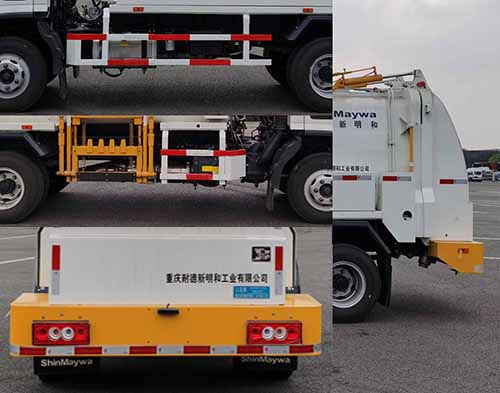 1. 该车通过垃圾箱、提桶机构、推板、液压系统等装置,达到垃圾收集及卸料的作业功能;2.侧面防护装置所用材料材质:Q235,连接方式:螺栓连接;后下部防护装置采用后门专用装置代替,专用装置最大离地高度490mm.驾驶室两端喷涂总质量8275kg字样;3. 随底盘装有ABS,ABS系统控制器型号/生产企业:ABS-E/威伯科汽车控制系统(中国)有限公司,ABS-VIE/广州瑞立科密汽车电子股份有限公司;4. F3.8NS6B156发动机最大净功率为112kW;5.选装无水箱装置外形,带卸料装置后门. |
