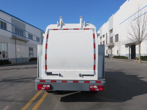 | 车辆装有侧装垃圾桶升降装载装置、密封式垃圾箱体、推卸机构、后卸料门等专用装置,主要用来收集和转运餐厨垃圾.随底盘选装限速装置,对应最高车速80km/h.前保险杠下方可随底盘选装阻尼装置.前雾灯可随底盘选择取消.随底盘选装黑色轮辋.随底盘扩展组合尾灯.随底盘选装油箱.选装联杆式垃圾桶升降装置,对应宽度2130mm.选装箭头式作业指示灯.选装称重系统.选装导流挡板.选装不带洗车装置,对应整备质量4660kg,额定载质量3345kg.选装带卸料装置后门,对应整备质量5070kg,额定载质量2935kg.ABS系统型号:VIE ABS-II,ABS系统生产厂家:浙江万安科技股份有限公司.车辆侧面防护装置的材料材质为铝合金,连接方式为螺栓连接.后下部防护装置采用后门专用装置代替,最大离地高度为430mm. |