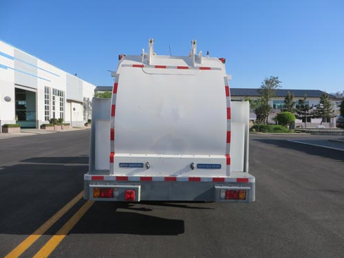 车辆主要专用装置有侧装垃圾桶升降装载装置、密封式垃圾箱体、推卸机构、后卸料门,主要用于收集和转运餐厨垃圾.随底盘选装“NQR”标牌.选装后视镜款式.选装后背式排气尾管形式.选装后处理保护支架.选装加宽式轻量化箱体,对应宽2240mm,整备质量5590kg,额定载质量4765kg.选装带卸料装置后门,对应整备质量5990kg,额定载质量4365kg.选装带排污装置排料门.选装举升自卸式箱体.选装单开启式入料口,对应高2790mm.选装加热装置.选装导流挡板.选装称重系统.选装箭头式作业指示灯.选装新式车辆外部标识牌.ABS及控制器型号为:APG3550500H1,生产厂家为:浙江亚太机电股份有限公司.车辆侧面防护装置的材料材质为铝合金,连接方式为螺栓连接.后下部防护装置采用后门专用装置代替,最大离地高度为480mm. |