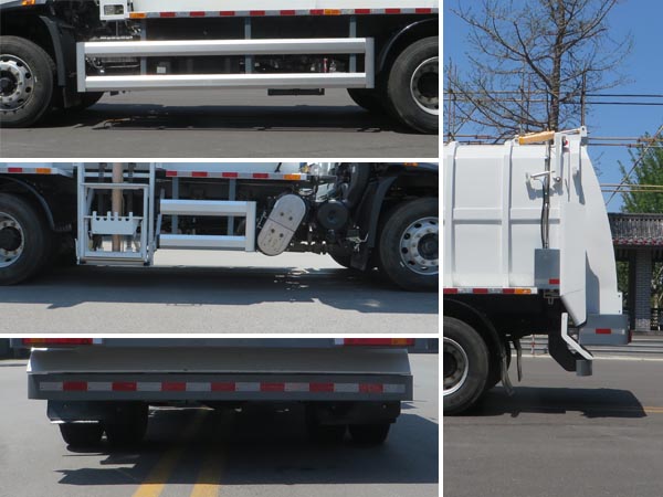 车辆装有侧装垃圾桶升降装载装置、密封式垃圾箱体、推卸机构、后卸料门等专用装置,主要用来收集和转运餐厨垃圾.仅选用4500mm轴距.随底盘选装无车门裙板.选装不同结构的车门裙板.选装踏步结构.选装后部灯具.选装前雾灯.选装驾驶室卧铺侧窗装饰板.选装前下视镜.选装与车身颜色相同的前保险杠.驾驶室前脸扰流罩为选装件.选装驾驶室顶部装饰灯.选装后视镜.选装驾驶室前面罩.选装前保险杠及前部灯具.长度/前悬对应关系为:7790/1400;7820/1430.选装箭头式作业指示灯.选装导流挡板.选装不同样式的车辆外部标识牌.选装配置A带过滤装置后门,外观未变化.选装配置B带卸料装置后门.选装配置C称重系统.选装配置D加热装置.选装配置A或B或C或D时,对应整备质量8700kg,额定载质量9105kg(驾驶室准乘人数3人);9170kg(驾驶室准乘人数2人).ABS型号/生产厂家:3631010-C2000/东科克诺尔商用车制动系统(十堰)有限公司,ABS 8/东科克诺尔商用车制动系统(十堰)有限公司,4460046450/威伯科汽车控制系统(中国)有限公司.车辆侧面防护装置的材料材质为铝合金,连接方式为螺栓连接.后下部防护装置的材料材质为Q235钢,连接方式为焊接,断面尺寸(mm)为80?60,最大离地高度为430mm. |