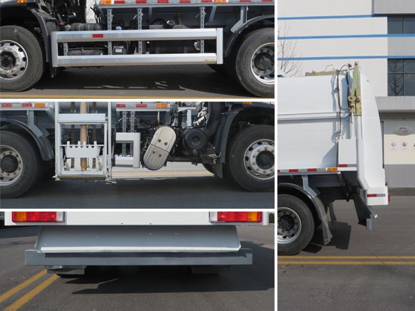 车辆装有侧装垃圾桶升降装载装置、密封式垃圾箱体、推卸机构、后卸料门等专用装置,主要用来收集和转运餐厨垃圾.仅选用3800mm轴距.随底盘选装不同结构的车门裙板.选装踏步结构.选装驾驶室卧铺侧窗装饰板.选装前雾灯.选装前下视镜.选装驾驶室顶部装饰灯.驾驶室前脸扰流罩为选装件.选装驾驶室前面罩.选装前保险杠及前部灯具.选装后视镜.选装后部灯具.选装驾驶室时,对应前悬1430mm,长度6935mm.选装垃圾桶提升装置.选装不带洗车装置,对应整备质量7950kg,额定载质量9855kg(驾驶室准乘人数3人);9920kg(驾驶室准乘人数2人).ABS型号/生产厂家:3631010-C2000/东科克诺尔商用车制动系统(十堰)有限公司,ABS 8/东科克诺尔商用车制动系统(十堰)有限公司,4460046450/威伯科汽车控制系统(中国)有限公司.车辆侧面防护装置的材料材质为铝合金,连接方式为螺栓连接.后下部防护装置的材料材质为Q235钢,连接方式为焊接,断面尺寸(mm)为80?60,最大离地高度为390mm. |