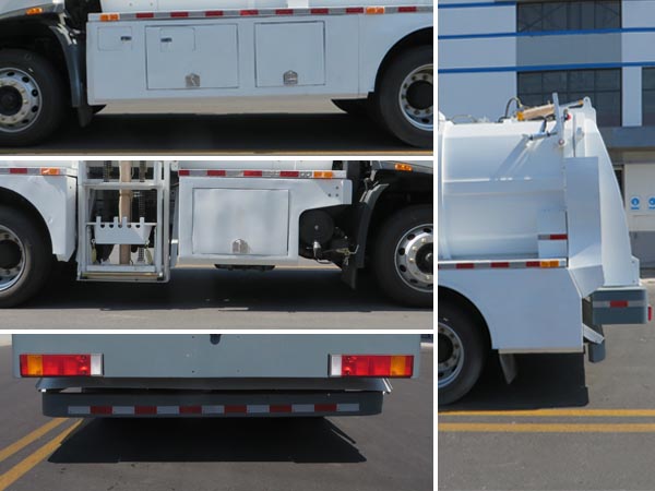 车辆装有侧装垃圾桶升降装载装置、密封式垃圾箱体、后卸料门等专用装置,主要用来收集和转运餐厨垃圾.仅选用3800mm轴距.随底盘选装前雾灯.驾驶室卧铺侧窗选装装饰板.选装上车踏板型式.选装驾驶室前面罩、前保险杠、前部灯具及后视镜(对应前悬1430mm,长度7120mm).驾驶室顶部中间三个装饰灯为选装件.驾驶室前脸扰流罩为选装件.选装后部灯具.选装箭头式作业指示灯.选装称重系统.ABS型号/生产厂家:3631010-C2000/东科克诺尔商用车制动系统(十堰)有限公司,ABS 8/东科克诺尔商用车制动系统(十堰)有限公司,4460046450/威伯科汽车控制系统(中国)有限公司.车辆侧面防护装置为裙板结构,材料材质为Q235钢,连接方式为螺栓连接.后下部防护装置的材料材质为Q235钢,连接方式为焊接,断面尺寸(mm)为80?60,最大离地高度为370mm. |