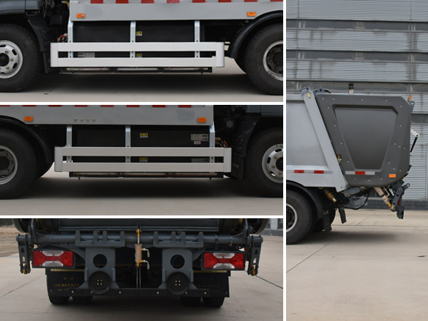 车辆主要专用装置备有垃圾箱体、压缩机构和装载机构,实现垃圾收集、压实、转运和卸料功能.仅选用3308mm轴距.后伸为154mm.随底盘选装无前下视镜.选装后视镜.选装驾驶室前围格栅.选装前保险杠外观.选装前部灯具.选装提升架A.选装ETC车载装置.选装轻量型上装,外观未变化,对应整备质量:6670kg,额定载质量:3130kg.选装轻量型后门,外观未变化,对应整备质量:6400kg,额定载质量:3400kg.ABS型号:VIE ABS-Ⅱ,生产企业:浙江万安科技股份有限公司.储能装置种类:磷酸铁锂蓄电池,生产企业:宁德时代新能源科技股份有限公司.驱动电机类型:永磁同步电机,型号:TZ370XS-LKM0759,生产企业:苏州绿控传动科技股份有限公司,额定功率:70kW,峰值功率:120kW.车辆侧面防护装置的材料材质为铝合金,连接方式为螺栓连接.后下部防护装置采用专用工作装置代替,最大离地高度为390mm. |