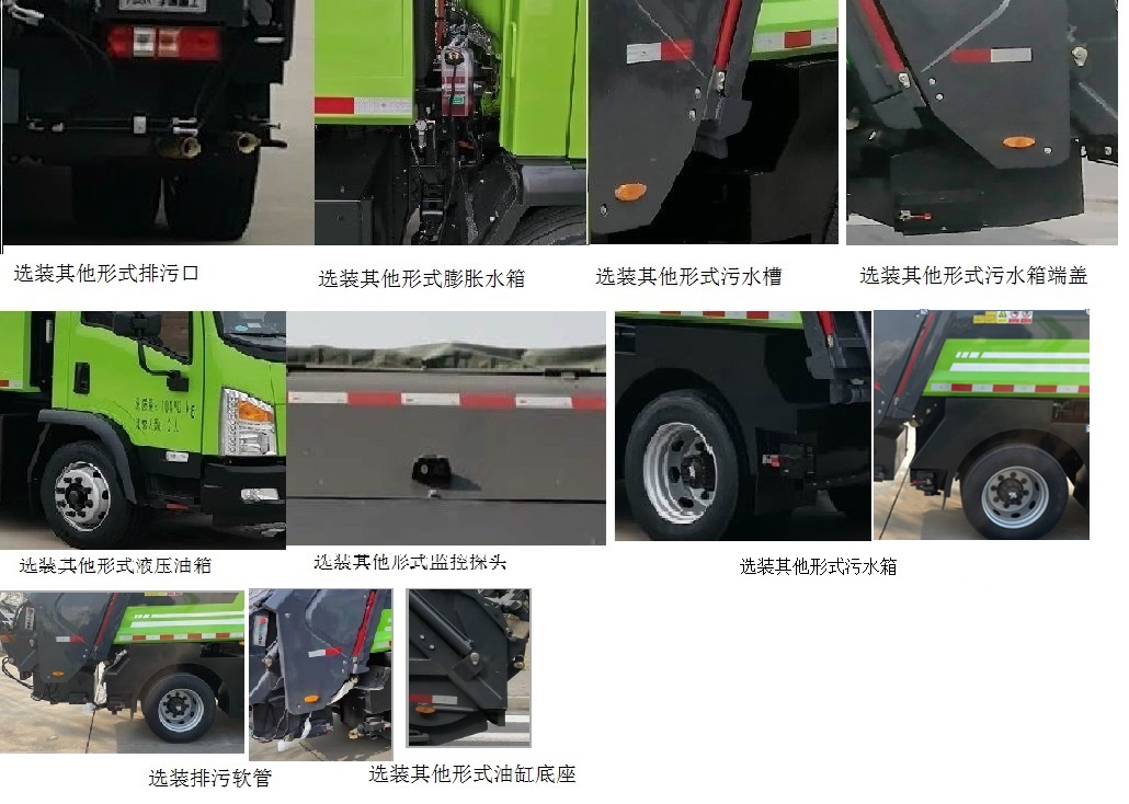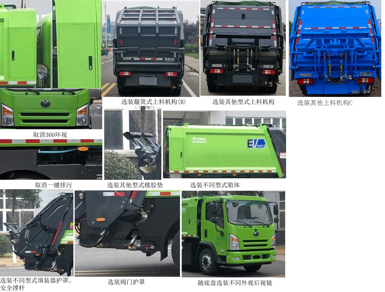 | 1.储能装置种类/生产企业:磷酸铁锂蓄电池/宁德时代新能源科技股份有限公司。2.可在全国销售。3.侧防护装置由车身结构替代;后防护装置由专用装置代替,专用装置离地高度为410mm。4.该车有两种配置,分别为挂桶式上料机构(A,C)、簸箕式上料机构(B);配置/整车长度(mm)/后悬(mm)/后伸(mm)对应关系分别为:A,C/6995/2140/205;B/6880/2055/175。5.可取消一键排污,可取消360环视。6.随底盘选装不同外观的后视镜,可选装其他型式橡胶垫,选装其他型式上料机构,可选装不同型式填装器护罩,安全撑杆,选装阀门护罩,选装其他型式排污口,选装其他型式膨胀水箱,选装其他型式液压油箱,选装其他型式监控探头,选装不同型式箱体,选装其他形式污水槽,选装其他形式污水箱端盖,选装其他形式污水箱,可选装排污软管,选装其他形式油缸底座,选装不同型式箱体时对应整备质量为7230kg,额定载质量为3130。7.ABS型号:ABS-E 4S/4M ,生产厂家:采埃孚商用车系统(青岛)有限公司。8.该车装有箱体、填装器、后上料装置,用于垃圾自行压实装入、转运和卸料。9.准乘人数/整备质量/额定载质量对应关系:2/7950/2410,2/7230/3130,3/7950/2345,3/7230/3065. |