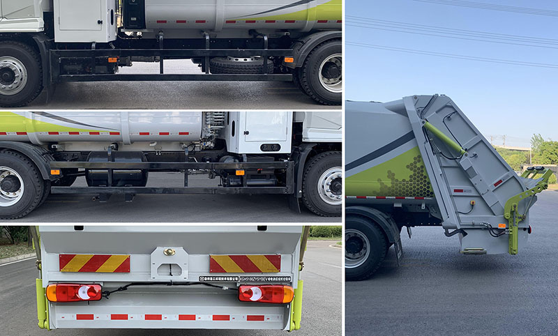 ABS系统型号:VIE ABS-II,生产企业:浙江万安科技股份有限公司.该车仅选用5000mm轴距,随底盘配装限速装置,最高车速为:89km/h;选装描述:装翻桶装置时,长9795mm,后悬3000mm,后伸320mm,整备质量11700kg;选装铲斗装置时,长9685mm,后悬2960mm,后伸250mm,整备质量12060kg;选装摆臂装置时,长9525mm,后悬2985mm,后伸65mm,整备质量11870kg;选装填塞器造型,选装抱爪机构,选装铲斗局部造型,副污水箱为选装件.随底盘选装导流罩,选装不带前置摄像头.选装导流罩、遮阳罩喷涂“吉利商用车”字样,该车型可选装ETC车载装置.储能装置种类/生产企业:磷酸铁锂蓄电池/宁德时代新能源科技股份有限公司;驱动电机额定功率/峰值功率:120kW/180kW;该车安装具有卫星定位功能的行驶记录仪;侧后防护情况:侧防护材质为Q235B,选装铝合金,连接方式为螺栓连接.后防护为专用装置替代,离地高度为395mm;专用功能及装置:该车专用装置有垃圾箱、填装器等,用于垃圾的收集、转运等工作. |