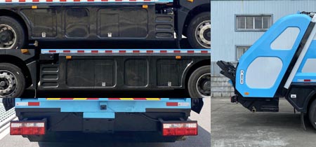 蓄电池种类/生产企业:磷酸铁锂蓄电池/宁德时代新能源科技股份有限公司;驱动电机生产企业/型号/类型/额定功率/峰值功率:上海盘毂动力科技股份有限公司/TZ430XS200ICS200K/永磁同步电机/120kW/200kW;电机控制器生产企业: KTZ54X57SPC900A/上海盘毂动力科技股份有限公司;专用装置有垃圾厢体、液压机构、垃圾装填器等专用装置,用于生活垃圾收集、压缩、卸料作业;仅采用4500mm轴距底盘,后伸为398mm;侧面防护装置为裙板式结构,材料Q235,与车辆连接方式为螺栓连接;后部防护装置工作装置替代,与车辆连接方式为螺栓连接,离地高度为480mm;ABS型号:CM4XL-4S/4M,ABS生产企业:广州瑞立科密汽车电子股份有限公司;选装不同结构、材质的垃圾厢和填料器,选装侧面防护装置:材质:5083铝合金,连接方式:螺栓连接;装备具有卫星定位功能的行驶记录仪,选装采用直接供电方式的ETC车载装置. |