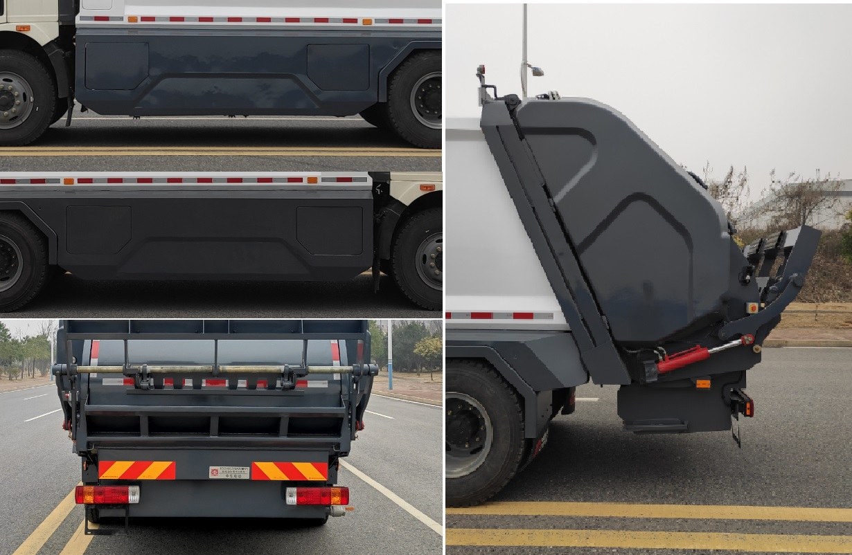 1.仅选用底盘轴距4500mm;2.储能装置种类/生产企业:磷酸铁锂动力电池/宁德时代新能源科技股份有限公司;3. ABS型号/生产厂家:CM4XL/长春科密汽车制动有限公司,44600XXXX0/WABCO;4.随底盘安装具有卫星定位功能的行驶记录仪;5.该车后部工作装置为翻桶上料装置时,整车长/后伸/整备质量/额定载质量:8920mm/550mm/11130kg/6675kg.为翻斗上料装置时,整车长/后伸/整备质量/额定载质量:8630mm/260mm/11290kg/6515kg;6.侧防护材料为玻璃钢,连接方式:螺栓连接.后防护由专用装置代替,离地高度为495mm;7.专用装置由密封式厢体,填料器总成,翻转机构等组成,专用功能为城乡生活垃圾收集,压缩,运输,推卸作业;8.驱动电机型号TZ370XS-LKM1101对应电机控制器型号KTZ54X45S-LKC1101,驱动电机型号TZ366XS50EA对应电机控制器型号KTZ54X40SP5S;9.该车型可选装ETC车载装置;10.随底盘选装侧标贴,选装新款前面罩. |