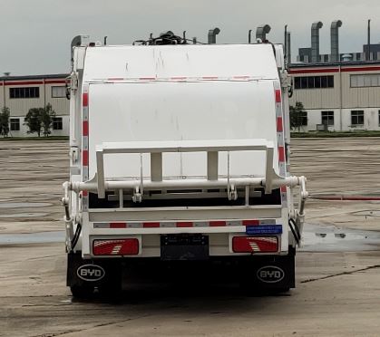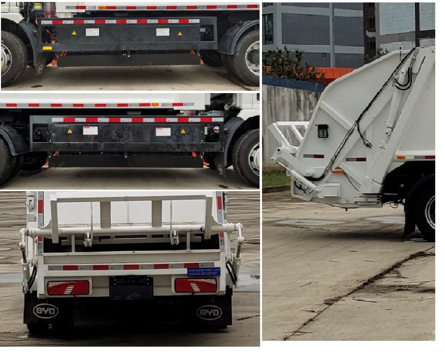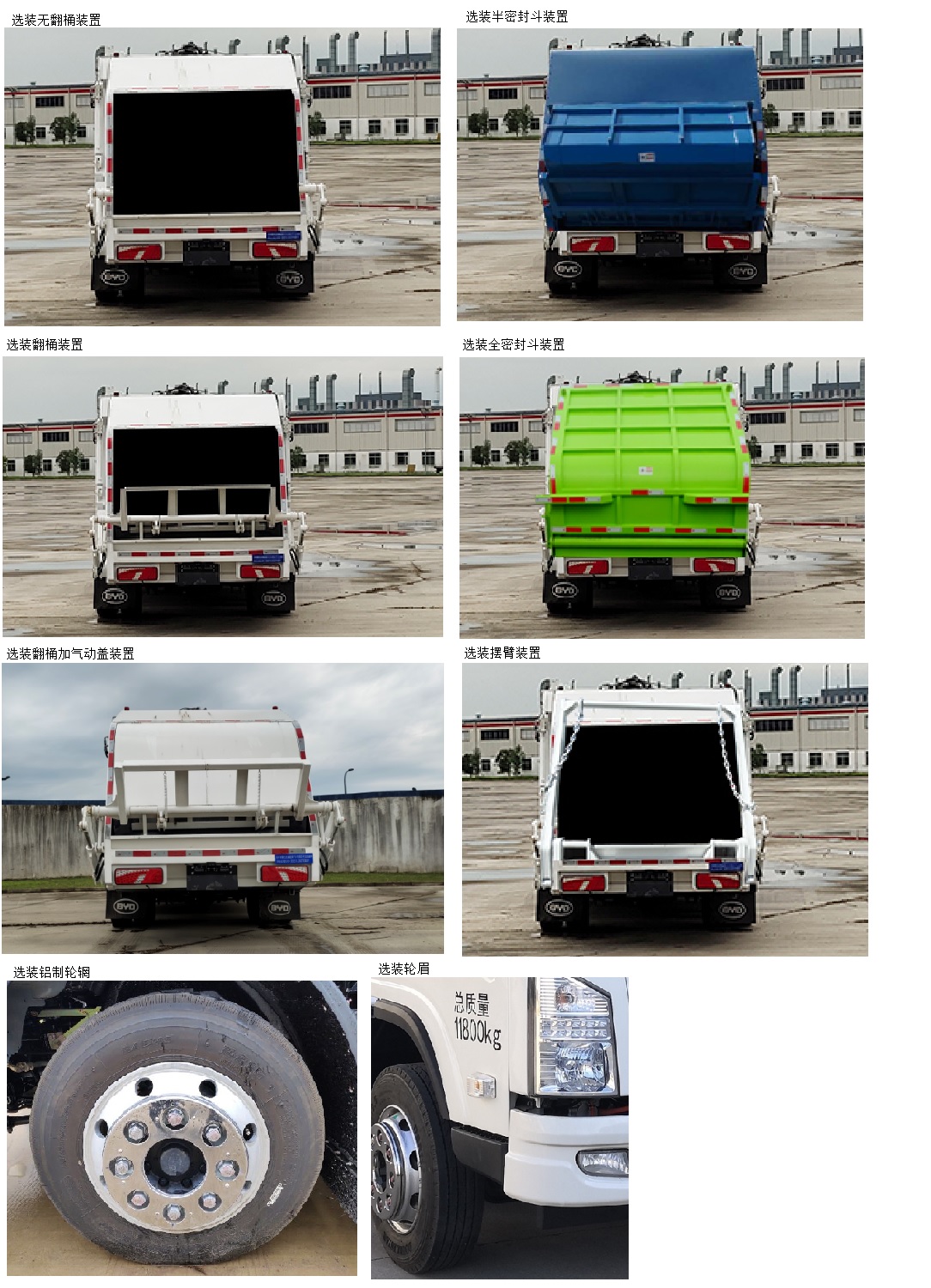 1.该车用于生活垃圾收集清运,主要专用装置主要有填装器、垃圾箱、翻桶机构、推铲、液压系统等;2.该装置可选装后工作装置.配置一:无翻转机构,整车长7250mm,整备质量:8450kg;配置二:选装翻桶装置,后伸380mm,整车长7630mm,整备质量:8450kg;配置三:选装翻桶加气动盖装置,后伸380mm,整车长7630mm,整备质量:8450kg;配置四:选装半密封斗装置,后伸380mm,整车长7630mm,整备质量:8450kg;配置五:选装全密封斗装置,后伸200mm,整车长7450mm,整备质量:8800kg;配置六:选装摆臂装置,后伸200mm,整车长7450mm,整备质量:8450kg;4.选装铝制轮辋,轮眉,该车型可选装ETC车载装置;5.侧防护采用螺栓连接,侧防护材料为铝材质,后防护由专用装置代替,下边缘离地高:460mm;6.动力蓄电池种类:磷酸铁锂蓄电池,生产企业:深圳市比亚迪锂电池有限公司(单体),汕尾比亚迪汽车有限公司(总成);7.驱动电机类型:永磁同步电机,额定功率95kW,峰值功率160kW,生产企业:精进电动科技股份有限公司;8.ABS系统生产企业:广州瑞立科密汽车电子股份有限公司,ABS系统型号:CM4XL-4S/4M;9.电池布置位置:车辆底部;10.可在全国销售 |