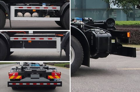 该车通过拉臂装置及液压系统,实现对垃圾的装载及卸料的作业功能;标配时整备质量为15160kg,额定载质量16710kg;选配拉臂装置时,整备质量为15860kg,额定载质量16010kg;该车侧面防护装置的材料为铝合金,连接方式为螺栓连接;后防护装置材料为Q355B,连接方式为螺栓连接,后部防护装置的断面尺寸为240?5mm,离地高度为430mm;安装具有卫星定位功能的行驶记录仪;该车技术阶段为"发展期",可在全国销售;动力蓄电池种类:磷酸铁锂蓄电池,生产企业:深圳市比亚迪锂电池有限公司(单体),汕尾比亚迪汽车有限公司(总成);驱动电机类型:永磁同步驱动电机,额定功率115kW,峰值功率140kW,生产企业:长沙市比亚迪汽车有限公司,采用双电机驱动.随底盘装ABS,ABS系统生产企业:克诺尔商用车系统企业管理(上海)有限公司,ABS系统型号:ABS8.还可选装拉臂外观,选装右后方罩盖. |