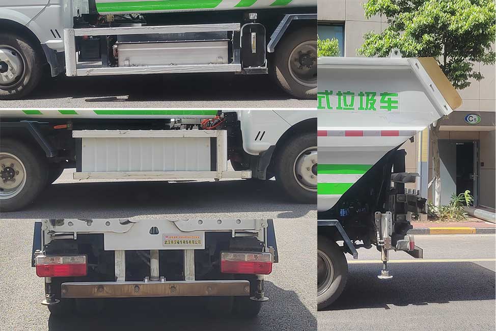 1.该车装备垃圾箱体,提桶机构,举升机构等专用装置,用于实现垃圾的收集、转运功能;卸料方式为:后卸;2.储能装置种类/生产企业:磷酸铁锂蓄电池/湖北亿纬动力有限公司;3.电机的额定/峰值功率:55kW/110kW;4.侧面防护装置材料为铝合金,连接方式为螺栓连接,后下部防护装置由专用装置替代,离地高度:395mm;5.ABS型号/生产企业:RL-108/瑞立集团瑞安汽车零部件有限公司;6.可选装ETC车载装置;选装不同的后提桶机构,电池防护罩;7.该车配备千斤顶,三角警示牌,反光背心,随车工具包,无备胎,冷却液,液压油加注正常对应整备质量3130kg;8.货厢重量:720kg;货厢材质:Q345;货厢厚度:侧板3m,底板4mm,上板2mm,前板3mm,后斜板3mm. |