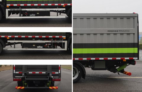 该车选用3850mm底盘轴距,该车专用功能是用于垃圾桶的装卸及运输,专用装置为液压尾板,用于升降垃圾桶;厢体顶盖可升降;尾板质量为350kg;尾板收起状态的水平长度200mm;该车可选装厢体顶盖外观;侧面防护装置材料为铝合金,连接方式为螺栓连接,后防护装置材料为Q235B,连接方式为螺栓连接.后部防护装置的断面尺寸为φ120?mm,离地高度为300mm;该车型可选装ETC车载装置;电池种类/生产企业: 磷酸铁锂电池/宁德时代新能源科技股份有限公司;随底盘装ABS,ABS系统生产厂家/型号:广州瑞立科密汽车电子股份有限公司/CM4XL-4S/4M. |