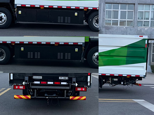 1.储能装置种类/生产企业: 磷酸铁锂蓄电池,生产厂家:宁德时代新能源科技股份有限公司(单体),郑州深澜动力科技有限公司(总成)。2.可在全国销售。3.侧防护装置由车身结构替代;后防护装置材质为Q235A,与车辆连接方式为螺栓连接,截面尺寸为φ102mm,离地高度为350mm。4.ABS型号/生产厂家: ABS-E 4S/4M/采埃孚商用车系统(青岛)有限公司。5.选装顶部不带装饰边的箱体、选装操控箱,随底盘选装不同外观电池箱。6.准乘人数(人)/额定载质量(kg)对应关系为:2/2960,3/2895;2/3120,3/3055。7.该车装备有液压尾板、液压升降顶盖等专用装置,用于桶装垃圾收集转运。8.可选装四款液压尾板,液压尾板(A、D)质量为450kg,液压尾板收起状态的水平长度为225mm;液压尾板(B、C)质量为350kg,液压尾板收起状态的水平长度为205mm。9.厢体顶部可开启。10.随底盘安装有限速装置,限速80km/h。11.该车可选装ETC。12.整车长度(mm)/后悬(mm)对应关系:7490/2440,7265/2215。 |