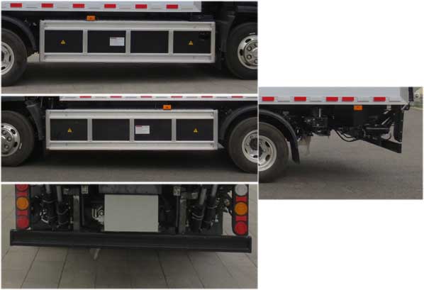 1.动力蓄电池种类:磷酸铁锂电池,生产企业:深圳市比亚迪锂电池有限公司,型号:C16FHA 。2.随底盘选装导流罩、车门、驾驶室。3. 侧防护材料为铝材质,连接方式为螺栓连接;后防护材质为Q235钢,连接方式为焊接连接,防护装置的断面尺寸(mm)为40?20,离地高度为400mm。4.产品的技术阶段:发展期。ABS系统生产企业:芜湖伯特利电子控制系统有限公司,ABS系统型号:BTL。5.本车安装厢体及液压尾板,主要用于市政环卫垃圾分类桶的回收与运输,尾板收起状态水平长度为260mm,尾板质量为350kg。6.车厢顶部封闭,顶盖可升降。 |