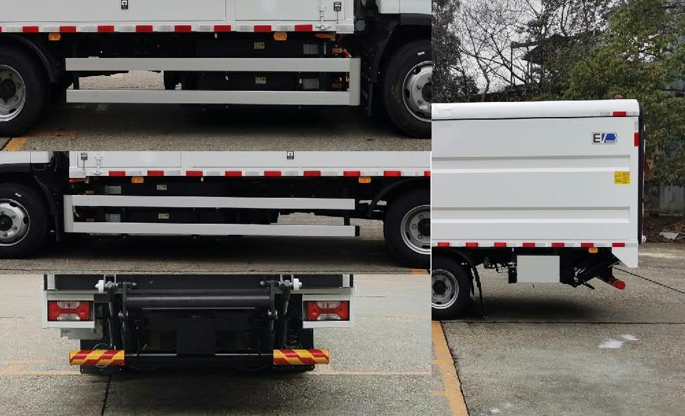 1.该车专用功能是用于垃圾桶的装卸及运输,专用装置为液压尾板,用于升降垃圾桶;2:厢体顶盖可升降;3.尾板收起状态的水平长度为280mm,液压尾板质量450kg;4.侧防护材料为6061,后防护材料为Q235A,连接方式为螺栓联接,后防护栏断面尺寸为直径102mm(圆管),离地高度为420mm,5.ABS型号为:VIE ABS-Ⅱ,生产企业为:浙江万安科技股份有限公司;6.储能装置种类:磷酸铁锂电池,型号:L173TB2,生产企业:宁德时代新能源科技股份有限公司;7.驱动电机类型为永磁同步电机,型号为TZ370XS-LKM0759,额定功率为70kw,峰值功率为120kw,生产企业:苏州绿控传动科技有限公司;8.随底盘选装前部灯具和驾驶室前围面板以及无前下视镜,该车型可选装直接供电方式的ETC车载装置.选装尾板,收起状态的水平长度为240mm,对应后防护离地高度470mm |