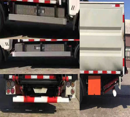 该车专用装置为垃圾厢、起重尾板及升降顶盖装置,用于桶装垃圾的收集转运作业。车厢顶部封闭,顶盖可向上开启。整备质量含随车工具。厢体重量为680kg,材质为Q235B,底板厚3mm,侧板厚2mm。尾板收起状态的水平长度200mm。尾板质量为350kg。选用2800mm轴距。当长度为5995mm时,后伸195mm。选装不同的液压尾板。侧防护材质为铝合金,采用螺栓连接;后防护装置材料为Q235B,采用焊接加螺栓连接,截面为直径110mm的圆管,最大离地高度300mm。随底盘安装的ABS型号/厂家:CM4YL/广州瑞立科密汽车电子股份有限公司。储能装置种类/生产企业:磷酸铁锂电池/宁德时代新能源科技股份有限公司。该车可选装直接供电式ETC车载装置。 |