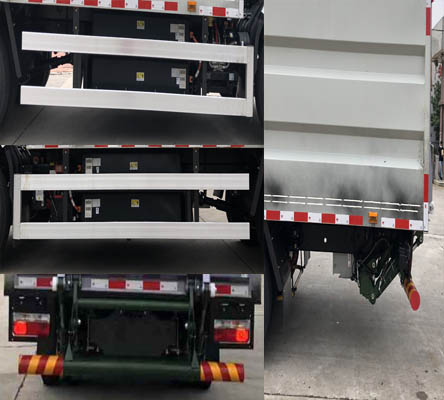 该车通过垃圾箱、起重尾板及液压升降顶盖装置,用于桶装垃圾的收集转运作业。尾板收起状态的水平长度200mm。尾板质量为350kg。选装不同厂家尾板。选装尾部操作按钮盒。侧防护材料为铝合金,采用螺栓连接;车辆尾部安装的液压尾板带有截面为直径110mm的圆管,充当后防护装置,最大离地高度410mm。随底盘安装的ABS型号及生产厂商为:ABS/ASR-12V-4S/4M/襄阳东风隆诚机械有限公司。该车技术阶段为"发展期",可在全国销售。电池种类/ 型号/生产企业: 磷酸铁锂电池/CB220/宁德时代新能源科技股份有限公司。该车可选装直接供电式ETC车载装置。 |