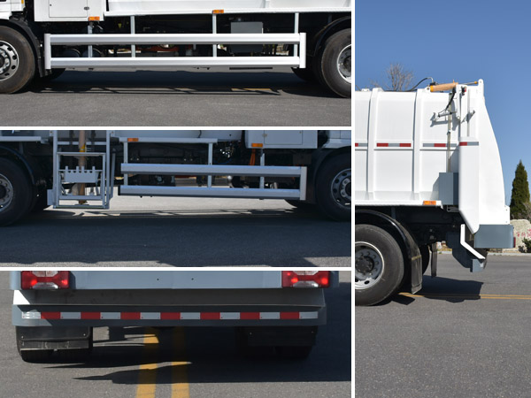 车辆主要专用装置有侧装垃圾桶升降装载装置、密封式垃圾箱体、推卸机构,主要用于收集和转运餐厨垃圾.轴距:5200mm.选装轻量型上装,外观未变化,对应整备质量9400kg,额定载质量8405kg.选装带卸料装置后门,对应整备质量9980kg,额定载质量7825kg.选装不同款式的车辆外部标识牌.选装作业指示灯.选装排污管.选装垃圾量可视系统.选装导流挡板.选装不同材料材质的侧面防护装置.ABS型号:VIE ABS-Ⅱ,生产企业:浙江万安科技股份有限公司.储能装置种类:磷酸铁锂蓄电池,生产企业:宁德时代新能源科技股份有限公司.驱动电机类型:永磁同步电机,型号:TZ370XS-LKM1307,额定功率:100kW,峰值功率:185kW.车辆侧面防护装置的材料材质为铝合金,选装材料材质为Q235钢,连接方式均为螺栓连接.后下部防护装置的材料材质为Q235钢,连接方式为焊接,断面尺寸(mm)为80?60,最大离地高度为445mm. |