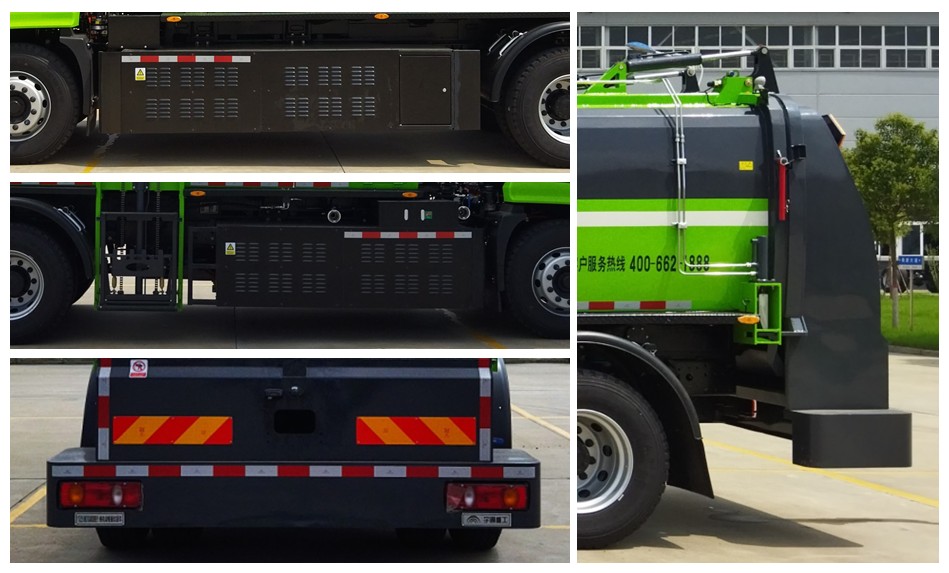 1.储能装置种类/生产企业:磷酸铁锂蓄电池/宁德时代新能源科技股份有限公司。2.可在全国销售。3.侧防护装置由车身结构替代;后防护装置由车身结构替代,离地高度480mm。4.ABS型号:ABS-E 4S/4M ,生产厂家:采埃孚商用车系统(青岛)有限公司。5.该车用于餐厨垃圾收集清运,主要专用装置为箱体、上料机构、推铲。6.360环视、倒车监视、后门箭头灯、清洗系统、污水箱及接口、左侧爬梯和上料操作手柄为选装件,可取消。7. 随底盘选装不同后视镜(A/B),随底盘选装遮阳罩、驾驶室前面罩、不同外观电池箱;可选装后门安全撑杆操作机构、不同型式上料机构(A/B/C/D/E/F/G)、不同位置后摄像头、不同型式左侧爬梯、低投料口、不同型式投料口、不同位置观察窗、螺旋卸料、不同外形充电盒、液压管路不同布置走向。8.选装低投料口或不同型式投料口,对应高度为3060mm。9.选装螺旋卸料时,对应整备质量为10460kg;准乘人数(人)/整备质量(kg)/额定载质量(kg)对应关系:2/10250/7620,2/10460/7410,3/10250/7555,3/10460/7345。10.随底盘选装有限速装置,限速90km/h。11.该车选用4700mm轴距。 |