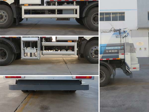车辆装有侧装垃圾桶升降装载装置、密封式垃圾箱体、推卸机构、后卸料门专用装置,主要用来收集和转运餐厨垃圾.仅选用4000mm轴距.随底盘选装侧部装饰板.选装导流挡板.选装称重装置.选装单开启式入料口.选装铝合金材质的新型上装,对应长7155mm,后悬1755mm,整备质量7900kg,额定载质量4460kg(准乘人数2人);4395kg(准乘人数3人).电池种类:磷酸铁锂动力电池,电池生产企业:宁德时代新能源科技股份有限公司.技术阶段为"发展期".ABS生产厂家:1.长春瑞立科密汽车电子有限公司,型号:CM4XL.ABS生产厂家:2.WABCO,型号:44600XXXX0.车辆侧面防护装置的材料材质为铝合金,连接方式为螺栓连接.后下部防护装置的材料材质为Q235钢,连接方式为焊接,断面尺寸(mm)为80?60,最大离地高度为395mm. |