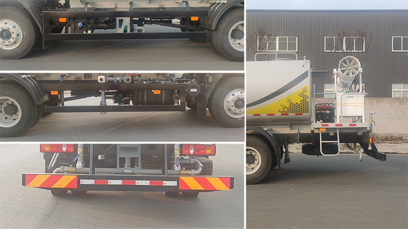| 车辆主要装置为水罐、水路及作业装置,主要用于街道、广场、小区等喷雾消毒作业及防疫预防.仅选用4500mm轴距.运输介质:消毒液,密度:850千克/立方米.罐体总容量13.44立方米,有效容积12.8立方米,罐体尺寸(长轴锥讨嶙长度)(mm):2440?600?800.无选装时,长度8295mm,接近角/离去角:18?11?后悬为2350/2450mm;选装前自动水炮或前鸭嘴2时,前伸525mm,长度8820mm,接近角/离去角:16?11?后悬为2350/2450mm;选装后部大平台或后雾炮时,长度8820或8770mm,接近角/离去角:18?10?对应后悬为2875或2925mm;选装前自动水炮+后部大平台或后雾炮时,前伸525mm,长度9345或9295mm,接近角/离去角:16?10?对应后悬为2875或2925mm;选装侧喷鸭嘴、罐体涂装外观、前鸭嘴样式、对冲、卷盘、顶部喷洒、后自动水炮、自吸进出水口、侧置自吸、后洒水路、炮托、工具箱、尾部上下喷雾、侧喷管、卷管架、箭头灯、尾部压力放水口、前鸭嘴位置;侧防护与后防护装置材质均为Q355B,连接方式均为螺栓连接,后防护截面为180?0mm,离地高度为450mm.ABS型号/企业:ABS-E 4S/4M/采埃孚商用车系统(青岛)有限公司,ABS 8/东科克诺尔商用车制动系统(十堰)有限公司,CM4XL-4S/4M/广州瑞立科密汽车电子股份有限公司.随底盘选装限速装置,限速89km/h. |
