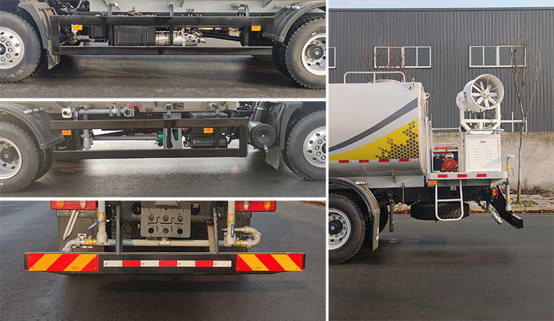 | 车辆主要装置为水罐、水路及作业装置,主要用于街道、广场、小区等喷雾消毒作业及防疫预防.仅选用4500mm轴距.运输介质:消毒液,密度:850千克/立方米.罐体总容量13.05立方米,有效容积12.42立方米,罐体尺寸(长轴锥讨嶙长度)(mm):2440?590?800.无选装时,长度8275/8075mm,接近角/离去角:25?17?后悬为2325mm;选装前自动水炮或前鸭嘴2时,前伸525mm,长度8800/8600mm,接近角/离去角:22?17?后悬为2325mm;选装后部大平台或后雾炮时,长度8800/8600mm,接近角/离去角:25?15?后悬为2850mm;选装鸭嘴、对冲、卷盘、顶部喷洒、后自动水炮、自吸进出水口、尾部上下喷雾、侧喷管、卷管架、箭头灯、尾部压力放水口、后洒水路、炮托、工具箱、前鸭嘴位置;侧防护与后防护装置材质均为Q355B,连接方式均为螺栓连接,后防护截面为180?0mm,离地高度为480mm.ABS型号及生产厂家为:3631010-C2000/东科克诺尔商用车制动系统(十堰)有限公司,J ABS/焦作博瑞克控制技术有限公司. |