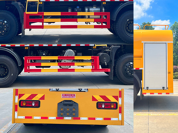 该车用于路面洒水,主要专用装置为罐体和喷洒总成.罐体总容量10.4立方米,有效容积9.97立方米;介质:水, 密度:1000千克/立方米.罐体外形尺寸(长壮ぶ嶙短轴)(mm):3700?350?450.ABS的型号:3631010-C2000,生产厂家:东科克诺尔商用车制动系统(十堰)有限公司;侧、后防护材料均为Q235,侧防护螺栓连接.后防护由车身结构代替,下边缘离地高度495mm.加装前部水炮时:整车长(mm)/前伸(mm)/接近角(?对应关系为:8350/650/13,选装不带前部水炮时:整车长(mm)/前伸(mm)/接近角(?对应关系为:7700/0/19.随底盘选装驾驶室. |