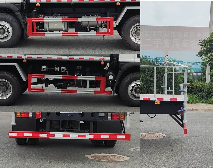 该车专用装置:水罐,水泵及喷洒装置,主要用于城乡园林绿化,路面喷洒,除尘和降温;罐体外形尺寸长(含封头)壮ぶ嶙短轴(mm):4100?350?560,罐体总容量:10.29立方米,罐体有效容积:9.8立方米;侧,后防护装置材料均为Q235,侧防护螺栓连接,后防护焊接连接,后防护截面尺寸为60mm?20mm,离地高度为:480mm;ABS型号为:CM4XL-4S/4M、VIE ABS-II,生产厂家为:广州瑞立科密汽车电子股份有限公司、浙江万安科技股份有限公司;仅选用3900mm轴距,安装前置电子炮时,外形尺寸为:8210mm前伸为:500mm.选装不安装前置电子炮.选装不同外形管道,选装风机样式,选装喷洒装置样式,选装后喷雾,选装左侧喷洒,选装右侧喷洒,选装后平台样式,选装右侧管道,选装自动球阀样式,选装LED箭头指示灯,LED箭头指示灯仅在车辆作业时开启,行驶过程中不可开启 |