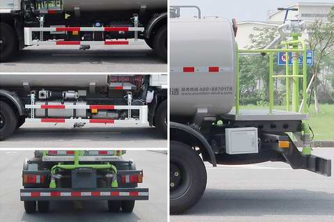 该车装有水罐、水泵、水路系统、控制系统,用于清洗路面、路面喷洒降尘等作业;标配时:整备质量3520kg,额定载质量3650kg,整车高2235mm,后悬1725mm,离去角13?罐体外形尺寸(长轴锥讨嶙长度)(mm):1800?105?810.对应罐体总容量3.83立方米,有效容积3.64立方米,配置前鸭嘴时,前伸230mm,整车长6390mm,接近角11?不配置前鸭嘴时,整车长6160mm,接近角20?选装无中平台配置时:整备质量3320kg,额定载质量3850kg,整车长度为6420mm,整车高2260mm,后悬1685mm,前伸300mm,接近角9?离去角15.7?罐体外形尺寸(长轴锥讨嶙长度)(mm):1610?110?190,对应罐体总容量4.04立方米,有效容积3.84立方米;侧防护装置材料为Q235A,连接方式为螺栓连接,可选装其局部外观;标配后防护装置材料为Q345A,后部防护装置的断面尺寸为180?5mm,离地高度为400mm,选装无中平台配置时后防护装置的材料为Q235A,后防护装置截面尺寸120mm?0mm,后防护离地高度为475mm,两种后防护装置连接方式均为螺栓连接;该车还可选装驾驶室外观,简易前平台,上绿化浇灌,低压软管冲洗系统,卷盘,上喷雾杆,后作业指示灯,后回水管路,后绿化浇灌,号牌板外观,该系列选装对于整车尺寸,重量变化可忽略不计;随底盘装有ABS,ABS系统型号:VIE ABS-II,ABS系统生产厂家:浙江万安科技股份有限公司.