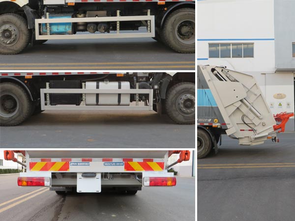 车辆通过垃圾箱,填料器等装置,达到垃圾收集压缩卸料的作业功能.仅选用4350+1350mm轴距.后伸为350mm.随底盘选装车门装饰图案.选装前围和灯具.选装宽体保险杠.选装脚踏板.选装前脸无"中国一汽"标识.选装翼子板.选装门把手.选装后处理装置外观及位置.选装箱体边板造型.选装后部工作装置.选装ETC车载装置.ABS生产厂家/型号:长春瑞立科密汽车电子有限公司/CM4XL,威伯科汽车控制系统(中国)有限公司/ABS-E.装备限速装置,限速89km/h.安装具有卫星定位功能的行驶记录仪.发动机CA6DK1-26E6,CA6DK1-28E6,CA6DK1-32E6对应的燃料消耗量均为:30.74L/100km.车辆侧面防护装置的材料材质为铝合金,连接方式为螺栓连接.后下部防护装置采用后部专用装置代替,最大离地高度为500mm. |