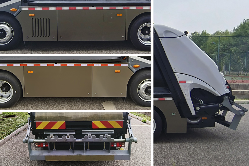 | 1.该车装备有垃圾箱体,液压装置及填装机构,用于将垃圾自行压实装入,转运和卸料功能;2.该车使用磷酸铁锂蓄电池,储能装置生产企业:宁德时代新能源科技股份有限公司(单体),宁德时代新能源科技股份有限公司(总成);3.驱动电机额定功率/峰值功率:90kW/160kW;4.ABS型号/生产厂家:CM4XL-4S/4M/广州瑞立科密汽车电子股份有限公司;5.装有卫星定位功能的行驶记录仪;6.该车型可选装ETC车载装置;7.侧防护为侧裙结构,材料为5052H34,连接方式为铰接;后防护装置由专用装置代替,专用装置离地高度为:304mm;8.该车有8种配置,分布为填装机构(A/B),箱体(D+E),填料器(F),顶置加长传感器(G),推铲(H),各配置整车长度(mm)/高度(mm)/轴距(mm)/后悬(mm)/后伸(mm)/整备质量(kg)对应关系分布为:配置1:(A+D+F+G+H):6995/2695/3300/2125/170/8450,配置2:(B+D+F+G+H):7045/2695/3300/2125/220/8450,配置3:(A+E+F+G+H):6995/2740/3300/2125/170/8450,配置4:(B+E+F+G+H):7045/2740/3300/2125/220/8450,配置5:(A+D+F+G+H):6995/2695/3300/2125/170/8660,配置6:(B+D+F+G+H):7045/2695/3300/2125/220/8660,配置7:(A+E+F+G+H):6995/2740/3300/2125/170/8660,配置8:(B+E+F+G+H):7045/2740/3300/2125/220/8660.;9.随底盘可选装驾驶室侧窗,可选装取消后工作灯,可选装过渡装置板,工作灯仅在作业时使用. |