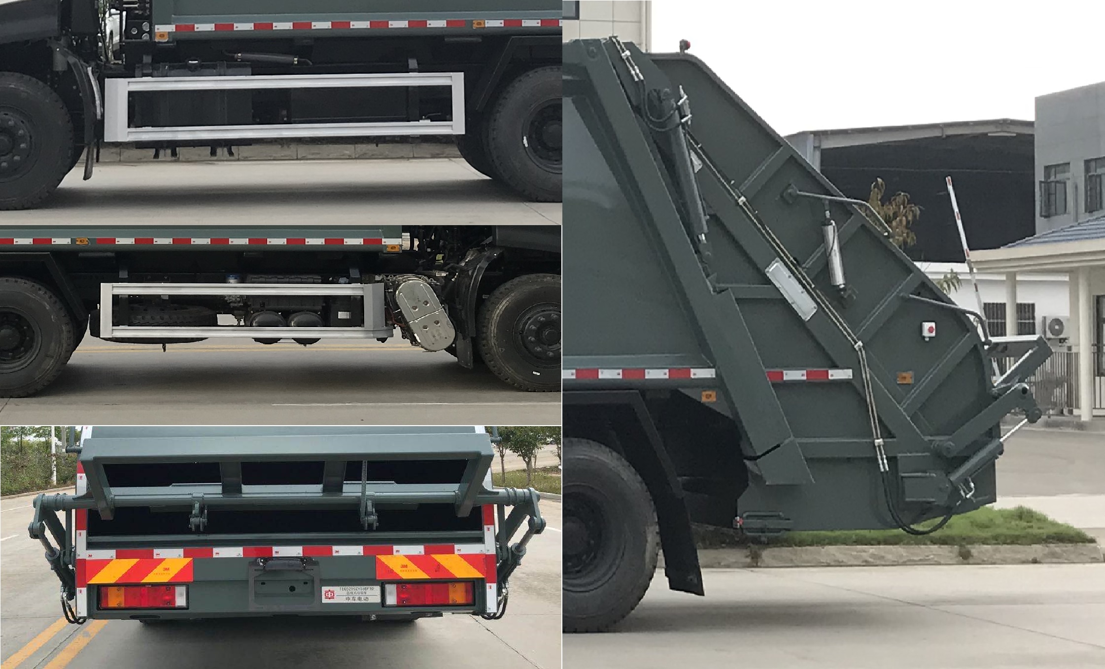 ABS型号:3631010-C2000,ABS 8;ABS生产企业:东科克诺尔商用车制动系统(十堰)有限公司,东科克诺尔商用车制动系统(十堰)有限公司;安装有限速装置;限速装置限速(km/h):89;安装有具有卫星定位功能的行驶记录仪;发动机净功率值:208kw(D6.7NS6B290),252kw(DDi75E350-60),215kw(DDi75E300-60);选装描述:仅采用轴距(mm)4350+1350;发动机/油耗值(L/100km)对应关系为:32(D6.7NS6B290),31.7(DDi75E350-60),31.7(DDi75E300-60);所用材料材质、连接方式以及后部防护装置的主要尺寸参数(断面尺寸和离地高度):侧防护采用冷弯型钢/Q235,螺栓连接,后防护由专用装置替代,下沿离地高为:495mm;专用功能及装置:该车主要专用装置由箱体,压缩机构组成,用于城市及乡填垃圾的收集与转运;;后伸尺寸:0mm(无上料装置),200mm(全密封斗装,摆臂装置),400mm(翻桶装置,半密封斗装置);其他说明:该车可选装方形或弧形箱体,选装全密封盖装置,选装后部工作装置,选装工作装置时,外形长(mm)/前悬(mm)/后悬(mm)/后伸(mm)对应关系:A、无上料装置:10030/1480/2850/-,10030/1500/2830/-,B、全密封斗装,摆臂装置:10230/1480/2850/200,10230/1500/2830/200,C、翻桶装置,半密封斗装置:10430/1480/2850/400,10430/1500/2830/400;随底盘选装驾驶室前角扰流板;选装驾驶室前面罩、前保险杠及前部灯具,选装驾驶室顶部中间三个装饰灯,选装前雾灯,驾驶室侧窗选装树脂装饰板,选装仅高度不同的驾驶室,选装后背式排气管;该车可选装ETC车载装置; |