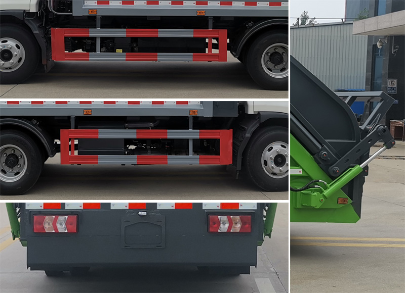 该车用于将垃圾自行压实装入、转运和卸料的专用汽车,专用装置为货箱和压缩机构;选装不同后部机构;外形长(mm)/前悬(mm)/轴距(mm)/后悬(mm)/后伸(mm)对应关系:6890/1075/3365/2100/350,6866/1051/3365/2100/350,6790/1075/3365/2100/250,6766/1051/3365/2100/250,6690/1075/3365/2100/150,6666/1051/3365/2100/150;侧防护材质为Q235,连接方式为螺栓连接,后防护由专用装置替代,离地高度(mm):400;ABS系统控制器型号/生产企业:CM4XL-4S/4M/广州瑞立科密汽车电子股份有限公司,VIE ABS-Ⅱ/浙江万安科技股份有限公司,ABS 8/克诺尔商用车系统企业管理(上海)有限公司;仅选用发动机与油耗值(L/100km)的对应关系为:D30TCIF2/16.2,YCY24140-60/15.39;安装直接供电式ETC车载装置;该车后部安装照明灯,仅在作业过程中点亮,行驶过程中不点亮;随底盘选装驾驶室,选装矮箱体外观;选装不同机构外观及箱体外观. |
