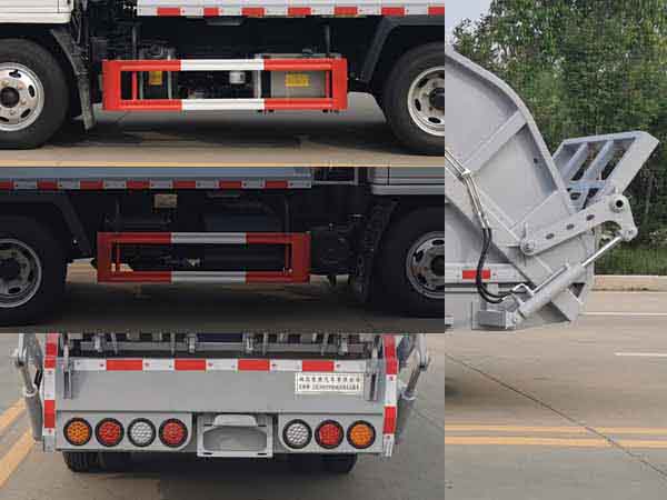 | 1、选装后部工作装置.选装工作装置时外形长/后伸对应关系为(mm):①翻桶装置:5995/270,②无上料装置:5725/- .该车主要专用装置为垃圾箱、压缩装置,用于垃圾清运。2、侧防护材料均采用Q235,螺栓连接;后防护由专用装置代替,下边缘离地高为450mm。3、ABS型号:CM4XL-4S/4M,ABS生产企业:广州瑞立科密汽车电子股份有限公司。发动机/油耗值(L/100Km)对应关系为:WP2.3NQ130E61/11.22,Q23-115E60/11.36。随底盘选装尾部灯具,选装厢体外观样式,选装弧形挡泥板。整备质量包括停车楔。选装液压油箱安装位置.选装后处理样式,选装电瓶、气瓶安装位置.选装厢体无爬梯. |