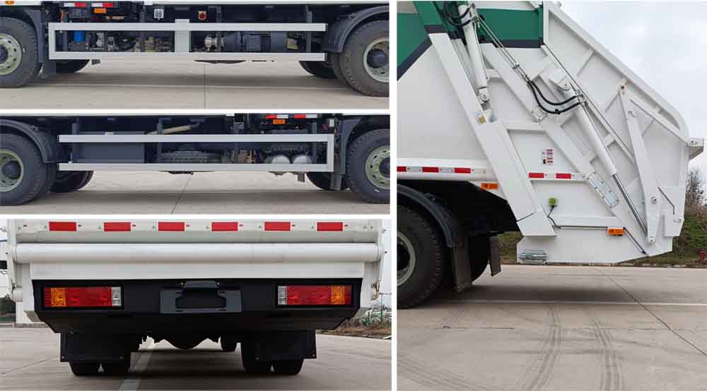 | 该车选用底盘5300mm轴距,该车通过垃圾箱、上料机构、填装器、液压系统、电气控制系统,达到垃圾收集装填转运的作业功能;安装全封闭翻斗装置时,整车长/前悬/轴距/后悬/后伸(mm)的对应关系:9720/1340/5300/2880/200,选装翻桶装置时,整车长/前悬/轴距/后悬/后伸(mm)的对应关系:9910/1340/5300/2880/390;侧防护装置材料为铝合金,连接方式为螺栓连接,后防护装置由工作装置替代,工作装置离地高为485mm;储能装置种类/型号/生产企业:磷酸铁锂蓄电池/CB230/宁德时代新能源科技股份有限公司;驱动电机类型为永磁同步电机,型号为TZ370XS027,额定功率为80kW,峰值功率为160kW;ABS系统生产厂家及型号分别为:广州瑞立科密汽车电子股份有限公司、型号:CM4XL-4S/4M;西安正昌电子股份有限公司、型号:ZQFB-V;该车型可选装ETC车载装置;随底盘选装同系列驾驶室、前组合灯具及后视镜,安装具有卫星定位功能的行驶记录仪;车辆后部安装作业照明灯具,仅在工作时开启,选装翻桶装置及尾部遮盖,选装翻桶装置不带尾部遮盖,可取消上装辅助动力电机 |