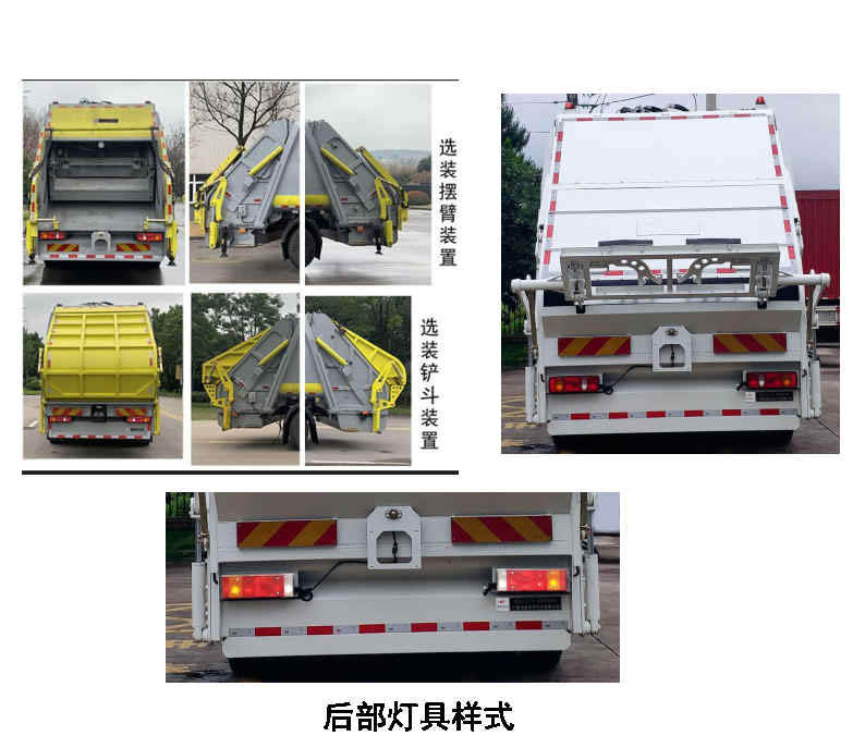 1.该车专用功能及装置:主要用于生活垃圾的压缩转运,专用装置为垃圾压缩装置.2.ABS型号:3631010-C2000;ABS生产企业:东科克诺尔商用车制动系统(十堰)有限公司;该车安装具有卫星定位功能的行驶记录仪;3.选用4350+1350(mm)轴距;参数对应关系(总长/后悬/后伸/整备质量/额定载质量:选装翻桶装置时:10020/2550/330/13880/10990(2人 ),10925(3人);选装铲斗装置时:9950/2560/250/14260/10610(2人 ),10545(3人);选装摆臂装置时:9780/2575/65/14150/10720(2人 ),10655(3人);4.随底盘选装驾驶室样式,选装后部灯具样式;该车可选装ETC车载装置;5.发动机/油耗值(L/100km)对应关系为:发动机D6.7NS6B320/31.1,D6.7NS6B230/31.0,B6.2NS6B260/31.7,YCS06270-60/31.4,YCK08300-60/30.3;6.侧后防护情况:侧防护材料为Q235B,连接方式螺栓连接;后防护为专用装置替代,离地高度为470mm.7.选装垃圾厢造型;8.随底盘选装后部灯具样式。 |
