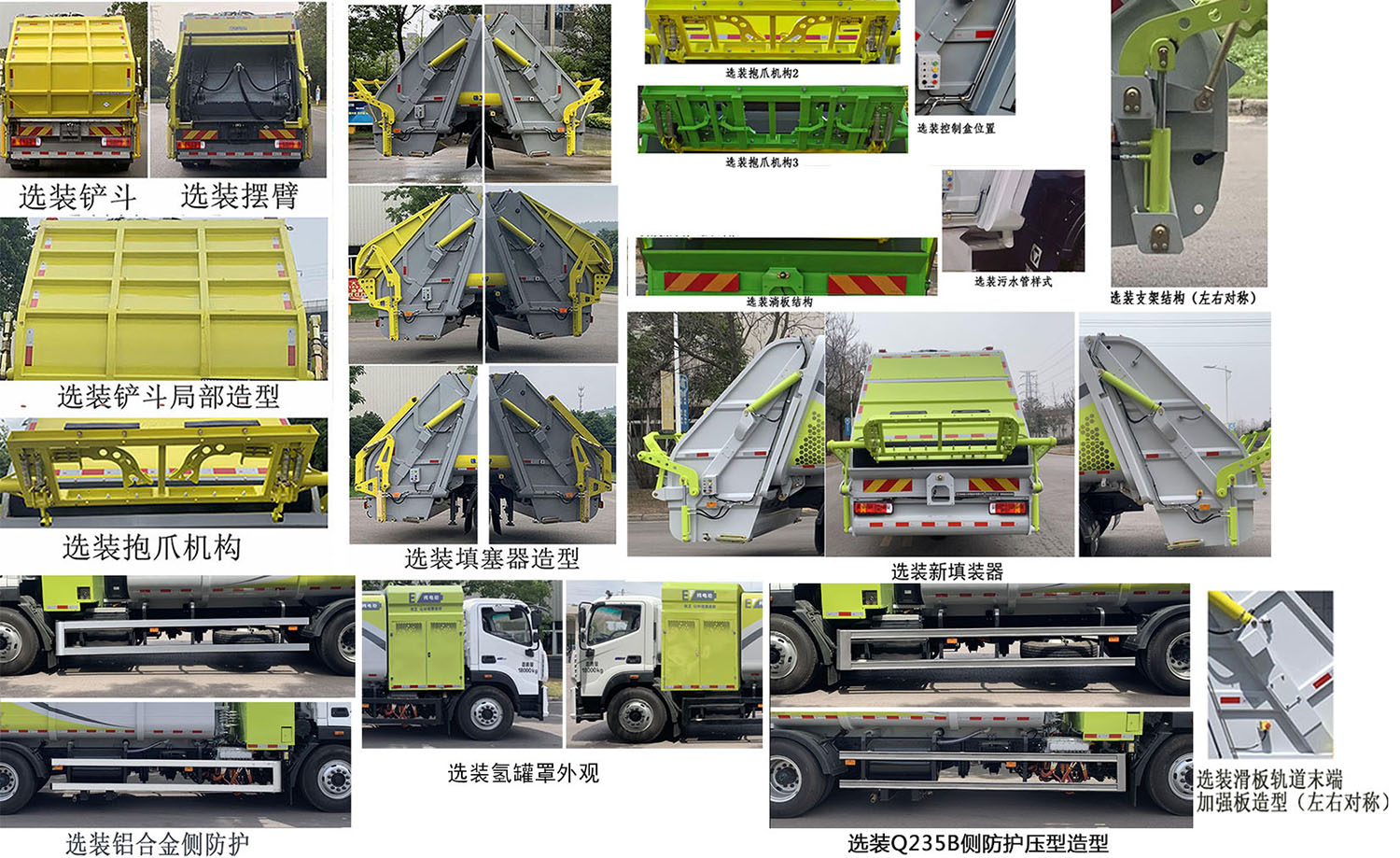 | ABS型号/生产企业:ABS-E/采埃孚商用车系统(青岛)有限公司.该车仅选用轴距5150mm.电池系统种类/生产企业:锰酸锂电池/天津荣盛盟固利新能源科技有限公司,电机型号/生产企业:FTTB080C/北汽福田汽车股份有限公司,额定功率:80kw,峰值功率:160kw;燃料电池种类、发动机型号、发动机生产厂家:氢燃料电池、YHTG120-145/330、北京亿华通科技股份有限公司;选装描述:装翻桶装置时,长9340m,后悬2600mm,后伸320mm,整备质量11380kg;选装铲斗装置时,长9230mm,后悬2560mm,后伸250mm,整备质量11740kg;选装摆臂装置时,长9070mm,后悬2585mm,后伸65mm,整备质量11550kg;该车型可选装ETC车载装置,选装填塞器造型,选装抱爪机构,选装铲斗局部造型,选装氢罐罩外观.选装支架结构,选装控制盒位置,选装淌板结构,选装污水管样式,选装新填装器;侧后防护情况:侧防护材料为Q235B或铝合金,选装Q235B侧防护压型造型,连接方式为螺栓连接.后防护材料为专用装置替代,离地高度为450mm.该车安装带有卫星定位功能的行驶记录仪专用功能及装置:该车装备有垃圾箱体,液压装置及垃圾装填器,用于将垃圾自行压实装入,转运和卸料功能. |