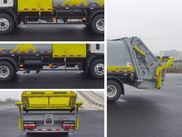 | ABS型号/生产企业:CM4XL-4S/4M/广州瑞立科密汽车电子股份有限公司,VIE ABS-II/浙江万安科技股份有限公司;电池种类/生产企业:磷酸铁锂蓄电池/宁德时代新能源科技股份有限公司;驱动电机额定功率/峰值功率:70kW/150kW;选装描述:仅选用3800mm轴距;选装翻桶装置时,长7610mm,后悬2300mm,后伸340mm,整备质量7200kg;选装铲斗装置时,长7490mm,后悬2360mm,后伸160mm,整备质量7470kg;污水箱为选装件;选装填塞器造型,选装翻桶装置无填塞器盖板,选装垃圾箱造型,选装电池罩;随底盘选装导流罩,选装不带前雾灯结构,选装前部"GLE"及银色"远程"字标,选装上车踏板外形结构.该车可选装车载ETC装置;侧后防护情况:侧防护材质为Q235B,连接方式为螺栓连接.后防护为专用装置替代,离地高度为480mm;专用功能及装置:该车专用装置有垃圾箱、填装器等,用于垃圾的收集、转运等工作. |