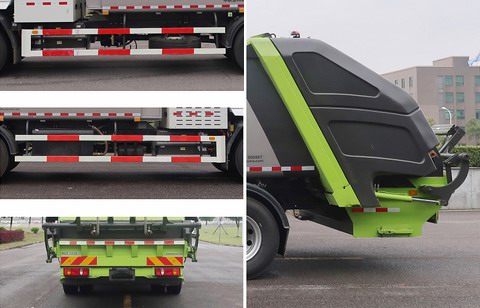 | 该车选用5300mm底盘轴距;该车通过垃圾箱,填装机构装置,达到垃圾收集装填及推挤卸料的作业功能;该车有3种配置:A(翻桶型),B(选装翻盖翻桶型),C(选装翻斗型).配置A时,整备质量11350kg,额定载质量6455kg;配置B时,整备质量11370kg,额定载质量6435kg;配置C时,整备质量11450kg,额定载质量6355kg;配置A时,整车长9895mm,后伸370mm;配置B时,整车长9595mm,后伸70mm;配置C时,整车长9850mm,后伸325mm;侧防护装置材料为Q235A,连接方式为螺栓连接;后防护装置由工作装置替代,工作装置的离地高度为480mm;电池种类/生产企业:磷酸铁锂电池/宁德时代新能源科技股份有限公司;电机种类/电机型号/电机生产企业/电机控制器型号/电机控制器生产企业/电机额定功率/电机峰值功率:永磁同步电机/TZ342XSSFY02/陕西法士特齿轮有限责任公司/KTZ54X46S-GVD55051/深圳市英威腾电动汽车驱动技术有限公司/110kw/180kw;燃料电池类型/生产企业:质子交换膜燃料电池/广东清能新能源技术有限公司;ABS型号/企业:ABS-E 4S/4M/威伯科汽车控制系统(中国)有限公司,CM4XL-4S/4M/广州瑞立科密汽车电子股份有限公司;安装具有卫星定位功能的行驶记录仪;可选ETC车载装置;还可选装翻桶装置(240L+660L),后牌照灯、牌照板外观,侧防护外观、中部整车附件布置外观. |