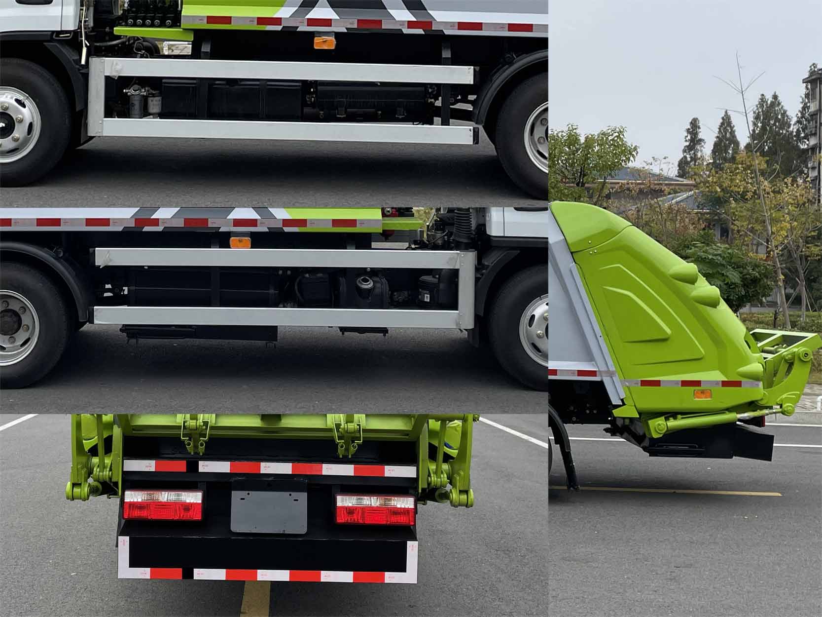 该车仅选用底盘3308mm轴距.该车通过垃圾箱、填装机构等装置,达到垃圾收集装填及推挤卸料的作业功能;该车有2种配置:A挂桶装置,B翻斗装置;配A时,整车长6840,前悬1055,后悬2127mm,后伸350mm;选装配备B时,整车长6610mm,前悬1055,后悬2127mm,后伸120mm.侧防护装置采用铝合金材质,螺栓连接,后下部防护由专用装置替代,离地面高度380mm.ABS厂家及型号:襄阳东风隆诚机械有限责任公司/ABS /ASR -12V-4S/4M.发动机与油耗值(L/100km)的对应关系为:CA4DB1-11E6/16.2,CY4BK161/16.2,CY4BK461/16.2,D20TCIF1/16.2,YCY24140-60/16.2,ZD30D16-6N/16.2,Q23-115E60/14.5,H20-120E60/14.9,CA4DB1-13E6/14.5;随底盘选装驾驶室。选装直接供电ETC车载装置。
