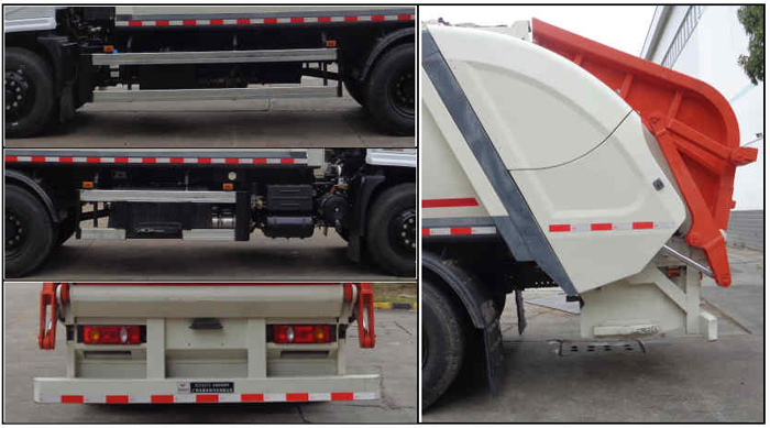 1.专用装置及功能:该车装备有垃圾箱体,垃圾压缩装置,垃圾装填器装置,用于将垃圾自行压实装入,转运和卸料功能;2.装备ABS,型号/生产厂家:3631010-C2000/东科克诺尔商用车制动系统(十堰)有限公司,ABS-E 4S/4M/威伯科汽车控制系统(中国)有限公司;3.安装有具有卫星定位功能的行驶记录仪;4.仅选用4500mm轴距,参数对应关系(总长/前悬/后悬/整备质量/额定载质量):8660/1440/2720/10200/7605(3人),7670(2人),8520/1300/2720/10200/7605(3人),7670(2人),8420/1200/2720/10200/7605(3人),7670(2人);5.随底盘选装驾驶室外观及附件,可选装ETC车载装置;6.侧防护装置材质为Q235,与底盘车架连接,连接方式:螺栓连接;后下部防护装置材质为Q235,截面尺寸:160?0?mm,离地高:415mm,连接方式:焊接;7.发动机/油耗值(L/100km)对应关系为:B6.2NS6B210/26.33,YCS04200-68/26.79,D4.0NS6B195/26.4,B6.2NS6B230/26.33,YCS06200-60/26.3,YCS06220-60/26.3,YCS06245-60A/26.3,D6.7NS6B260/26.9,YCS04220-61A/26.79;8.选装后部样式、驾驶室外观样式,随底盘选装附件安装位置。