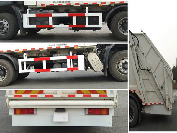 采用底盘4350+1350mm轴距.该车装有垃圾箱体、填装器、后上料装置,用以收集、处理、转运垃圾作业.侧面防护装置的材料材质为Q235A,连接方式为螺栓连接;后部工作装置充当防护装置.后下部工作装置最大离地高度为475毫米.该车安装具有卫星定位功能的行驶记录仪;随底盘装ABS,ABS型号/生产厂家:3631010-C2000/东科克诺尔商用车制动系统(十堰)有限公司,ABS 8/东科克诺尔商用车制动系统(十堰)有限公司,4460046450/威伯科汽车控制系统(中国)有限公司;发动机: D6.7NS6B290,DDi75E350-60,DDi75E300-60,DDi75E340-60,对应油耗申报值:31.3,31.7,31.7,28.71;随底盘选装驾驶室外观;选装经济型底盘时,装备质量14900kg,额定载质量9905kg.选装中、后轮挡泥板;随底盘选装尾气处理装置角度. |