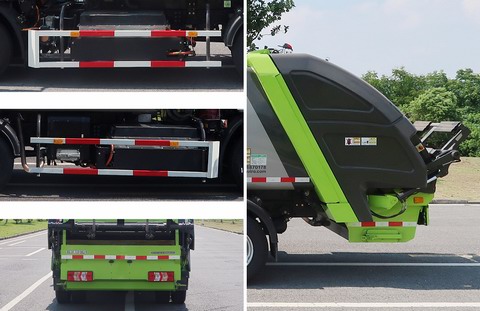 1.该车选用3360mm底盘轴距,该车通过垃圾箱,压缩机构等装置,达到垃圾收集装填及推挤卸料的作业功能;该车有3种后上料机构配置:A(无上料装置,基本型),B(选装翻桶装置),C(选装翻斗装置);配置A时,整备质量6905kg,额定载质量3395kg;配置B时,整备质量7100kg,额定载质量3200kg;配置C时,整备质量7170kg,额定载质量3130kg;配置A时,对应整车长度为6745mm,后悬2180mm;配置B时,整车长7140mm,后悬2180mm,后伸395mm;配置C时,对应整车长6865mm,后悬2180mm,后伸120mm;侧防护装置材料为Q235A;连接方式为螺栓连接;后防护装置由工作装置替代,工作装置的离地高度为430mm;该车型可选装ETC车载装置;2.该车可在全国销售,随底盘装ABS,ABS系统生产企业;广州瑞立科密汽车电子股份有限公司,ABS系统型号:CM4XL-4S/4M;3.动力蓄电池种类:磷酸铁锂蓄电池,生产企业:青海弗迪电池有限公司4.驱动电机类型:永磁同步电机,额定功率90kW,峰值功率160kW,生产企业:长沙市比亚迪汽车有限公司.可选装凸轮机构外观,铸件摇臂,后填装器盖外观,上装前顶部无吊耳外观.