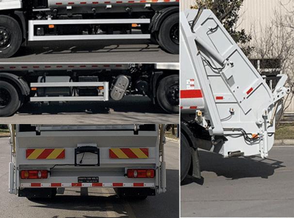该车专用装置为带推板的垃圾箱、填装器,具有垃圾刮入、压缩垃圾等功能,用于垃圾收集、转运等工作.仅选用底盘4500轴距;1:选装翻桶装置时,后悬2618mm,后伸322mm,整备质量9755kg,总长8870mm/8840mm;选装铲斗装置时,后悬2585mm,后伸250mm,整备质量10080kg,总长8765mm/8735mm;选装摆臂装置时,后悬2610mm,后伸65mm,整备质量9905kg,总长8605mm/8575mm;2:侧防护装置为铝合金或Q235材质,结构相同,连接方式为螺栓连接,后防护为专用装置替代,离地高度为485mm;3:ABS型号/生产厂家:3631010-C2000/东科克诺尔商用车制动系统(十堰)有限公司,ABS 8/东科克诺尔商用车制动系统(十堰)有限公司,4460046450/威伯科汽车控制系统(中国)有限公司,J ABS/焦作博瑞克控制技术有限公司;发动机对应的最大净功率(kw)和油耗值(L/100km)分别为D6.7NS6B230/166/23.7,B6.2NS6B210/151/23.8,B6.2NS6B230/166/23.8,DDi50E190-60/143/23.9,D4.5NS6B190/135/24.4,DDi50E220-60/158/25.1,D4.0NS6B185/131/25.2,D4.0NS6B195/138/26.0;4:选装不带副污水箱,随底盘选装后部灯具,选装高度不同的驾驶室;选装前雾灯;选装驾驶室顶部装饰灯;选装驾驶室前面罩;选装前保险杠及前部灯具,选装前下视镜,选装与车身颜色相同的前保险杠,选装不同结构的车门群板,选装无车门裙板,选装驾驶室卧铺侧窗装饰板,选装后视镜,选装油箱安装位置,选装踏步结构,选装后背式排气管;5:选装限速装置,限速89km/h。该车安装具有卫星定位功能的行驶记录仪,该车型可选装车载ETC装置。 |