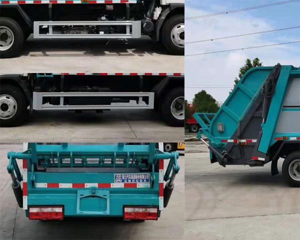 1.专用装置由箱体,压缩系统组成,该车主要用于城镇环卫垃圾的收集与转运;2.仅选用3365mm轴距底盘,①选装翻桶结构,长度/轴距/后悬/后伸量对应关系(mm):7020/3365/2180/400,②选装三角斗结构,长度/轴距/后悬/后伸量对应关系(mm):6900/3365/2180/280,③选装摆臂结构和落地斗结构,长度/轴距/后悬/后伸量对应关系(mm):6680/3365/2180/60;④选装箱体及多路阀外观样式;3.防护材料:Q235A,连接方式:左右侧面均采用焊接连接,后部防护由专用装置代替,离地高度为450mm;4.ABS型号/生产企业:VIE ABS-Ⅱ/浙江万安科技股份有限公司,选装ABS系统型号/厂家:CM4XL-4S/4M/广州瑞立科密汽车电子股份有限公司;;5.发动机与油耗对应关系(L/100km):D25TCIF1/15.6.随底盘选装驾驶室,选装直接供电的ETC.选装车辆外观 |