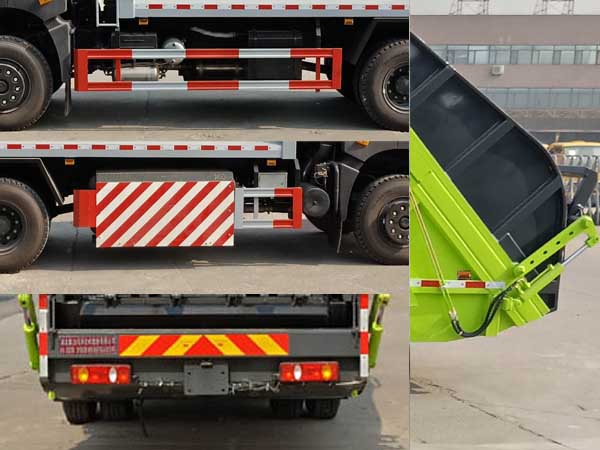 | 选装后部上料机构;整车长/轴距/后伸对应关系为(mm):8850/4700/320,8650/4500/320;ABS的型号及生产厂家:3631010-C2000/东科克诺尔商用车制动系统(十堰)有限公司,J ABS/焦作博瑞克控制技术有限公司;侧防护材料Q235,螺栓连接;后防护由专用装置代替,下边缘离地高度400mm;安装具有卫星定位功能的行驶记录仪;该车主要由箱体和压缩机构组成,用于垃圾压缩和运输. |