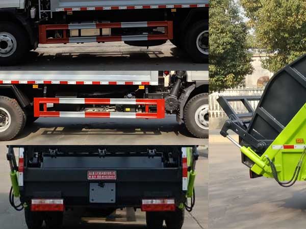 选装后部上料结构;整车长/轴距/后伸对应关系为(mm):7400/3845/370,7300/3845/270,6920/3365/370;侧防护材料Q235,螺栓连接;后防护由专用作业装置代替,下边缘离地高度500mm;发动机D30TCIF2油耗值(L/100km)为16.2;ABS系统控制器型号/生产企业:CM4XL-4S/4M,VIE ABS-Ⅱ/广州瑞立科密汽车电子股份有限公司,浙江万安科技股份有限公司;该车主要专用装置为垃圾箱及压缩机构,用于城市环卫垃圾压缩及运输. |