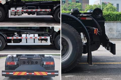 | 该车选用底盘4350+1350mm轴距该车通过拉臂装置及液压系统,实现对垃圾的装载及卸料的作业功能;标配拉臂装置、选配拉臂装置1时,整备质量10850kg,额定载质量14020kg(准乘人数2人),13955kg(准乘人数3人),整车长8350mm,对应后悬1250mm,整车高3070mm;选配拉臂装置2时,整备质量10530kg,额定载质量14340kg(准乘人数2人),14275kg(准乘人数3人),尺寸参数与标配时一致;选装底盘整体配置时整备质量10120kg,额定载质量14750kg(准乘人数2人),14685kg(准乘人数3人),整车长8410mm,对应后悬1310mm,整车高3025mm;侧面防护装置的材料为铝合金,连接方式为螺栓连接,可选装右侧防护的结构外观;后防护装置材料为Q345A或Q235A,与车辆连接方式均为螺栓连接;后部防护装置的断面尺寸为240?5mm或150?00mm,离地高度为440mm或480mm;该车安装具有卫星定位功能的行驶记录仪;随底盘装CA6DK1-26E6,CA6DK1-28E6,CA6DK1-32E6,CA6DK2A28E65,CA6DK2B32E65发动机,对应的油耗值(L/100km)均为27.75;随底盘装有ABS,ABS系统生产厂家:长春瑞立科密汽车电子有限公司,型号:CM4XL.可选装尾部快换接头布置位置;还可选装尾部拉臂装饰板,选装右侧标牌位置外观,选装后左侧挡泥板上工具箱,选装后视摄像头. |