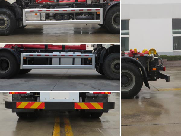 | 车辆主要用于城乡垃圾的收集、中转和运输,专用装置为装卸功能的拉臂钩.仅选用4350+1350mm轴距.随底盘选装车门装饰图案.选装前围和灯具.选装宽体保险杠.选装脚踏板.选装前脸无文字标识.选装翼子板.选装门把手.选装后处理罩外观.选装部件结构布置.选装新式车辆外部标识牌.选装ETC车载装置.ABS生产厂家/型号:长春瑞立科密汽车电子有限公司/CM4XL,威伯科汽车控制系统(中国)有限公司/ABS-E.发动机CA6DK1-26E6,CA6DK1-28E6,CA6DK1-32E6,CA6DK1-26E61,CA6DK1-28E61,CA6DK1-32E61对应的燃料消耗量均为30.74L/100km.装备限速装置,限速89km/h.安装具有卫星定位功能的行驶记录仪.车辆侧面防护装置的材料材质为铝合金,后下部防护装置的材料材质为Q235钢,连接方式均为螺栓连接,后下部防护装置的断面尺寸(mm)为80?60,最大离地高度为450mm. |